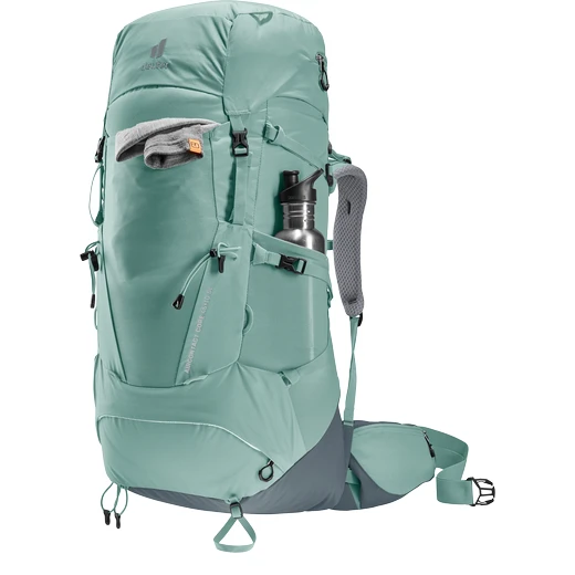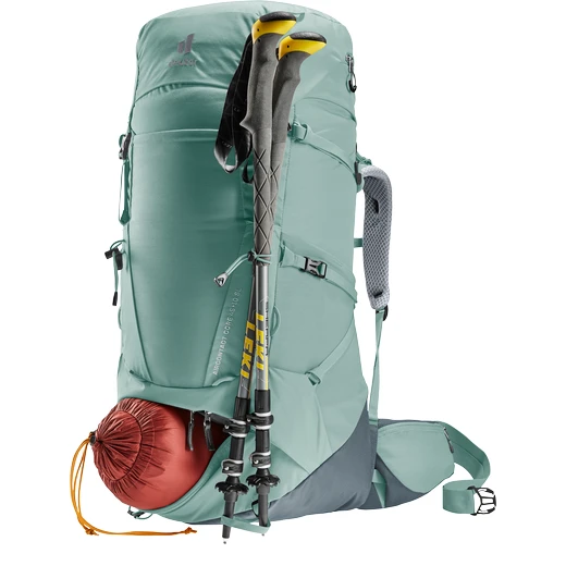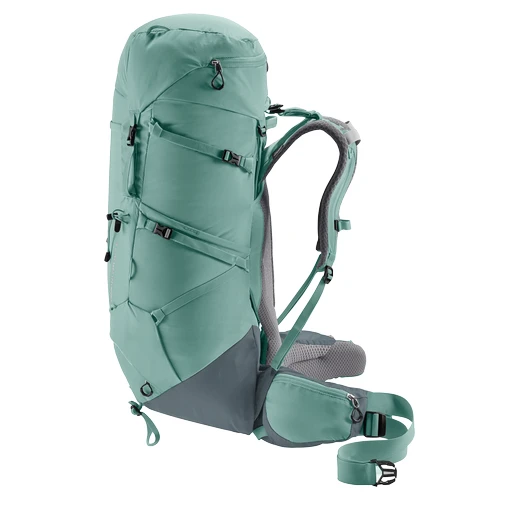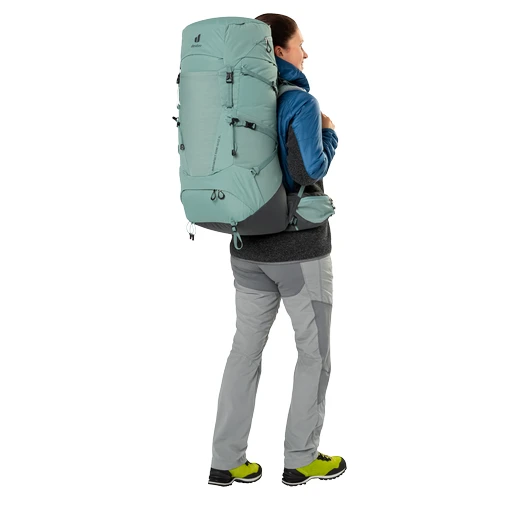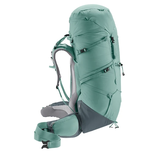 Très pratique d’utilisation, le Aircontact Core 45 + 10 SL Jade possède une ouverture frontale spacieuse en forme de J pour un accès rapide à toutes vos affaires et une bonne vue d’ensemble sans avoir à vider votre sac. Ses sangles de compression sont quant à elles très polyvalentes, puisqu’elles peuvent être fixées individuellement pour s’adapter à vos équipements variés. Natte isolante, tente, tapis de sol : tout pourra être fixé à votre sac de façon simple et intuitive. Enfin, son volume pourra être agrandi de 10 litres grâce à son rabat réglable en hauteur qui offre un espace de rangement stable, pour un volume total de 55 litres.