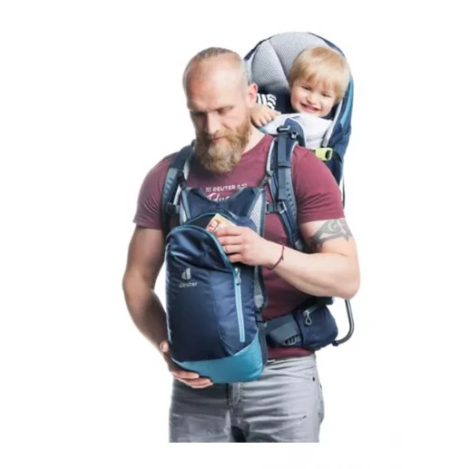Ce porte-enfant de la marque Deuter est doté d’un sac à dos de 10 litres, intégré et utilisable séparément. Vous avez la possibilité d’utiliser ses 3 poches extérieures et son compartiment inférieur afin de ranger des affaires importantes ou votre pique-nique. Il intègre également un pare-soleil fixé et un miroir pour avoir toujours un œil sur votre petit trésor.