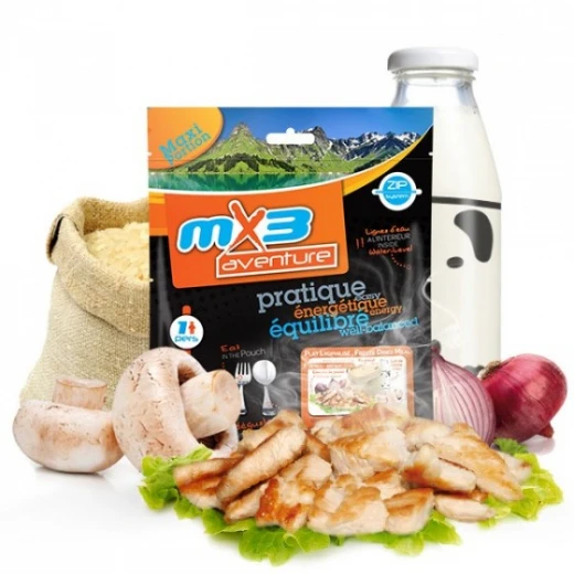 Repas lyophilisé de risotto au poulet avec sa sauce au curry qui conviendra parfaitement à vos treks et bivouacs. Poids net de 150g pour un poids réhydraté de 400g