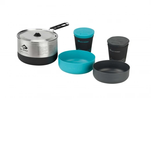Pratique et résistant, cet ensemble Sea To Summit de 610 grammes contient une casserole en acier inoxydable Sigmapot de 1,9 L, deux gobelets DeltaLight Insulmug de 350ml et deux assiettes DeltaLight Bowl.