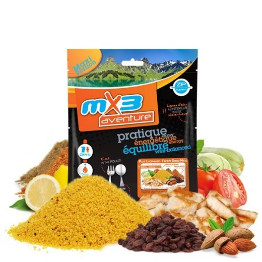 Repas lyophilisé de tajine de poulet qui vous fera voyager grâce à sa saveur et grâce à sa valeur nutritionnelle.