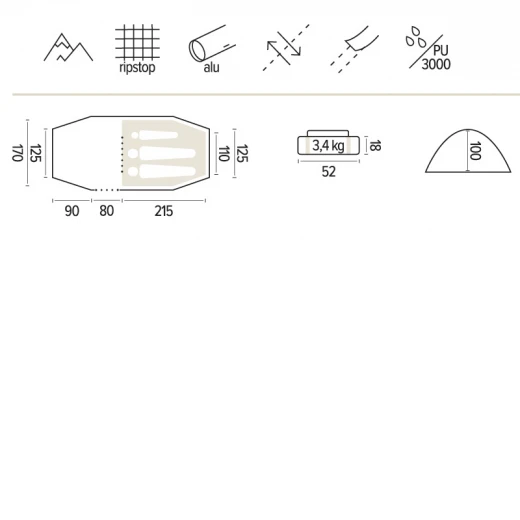 Dotée d’un bon rapport poids/volume et d’une très bonne tenue au vent, la structure hybride de cette tente Jamet de 3400 grammes combine la simplicité de montage d’une construction dôme et la légèreté d’une construction de type tunnel grâce à ses 3 arceaux en aluminium.