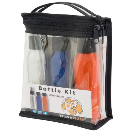 Le Bottle Kit Alu de la marque Travel Safe est un lot de trois petites bouteilles en aluminium qui vous permettront de transporter facilement vos produits d’hygiène.